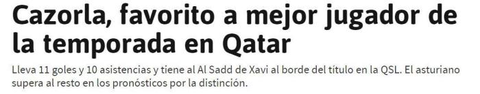 《阿斯报》表示,在最佳球员的评选中,卡索拉在个人数据和其他方面贡献上都远优于其他竞争对手,获得联赛MVP只是时间问题。