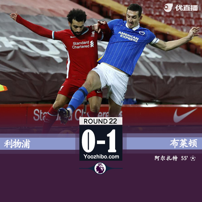 全场比赛结束,利物浦0-1不敌布莱顿,遭遇主场两连败。