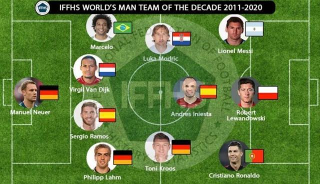 24直播网1月28日讯 国际足球历史和统计联合会(IFFHS)日前评选出2011-2020年的世界最佳阵容,梅西和C罗领衔,范迪克和莱万也入选。