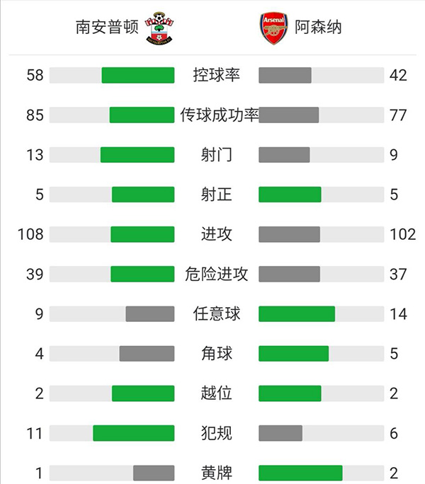 查看:南安普顿vs阿森纳 全场录像技术统计: