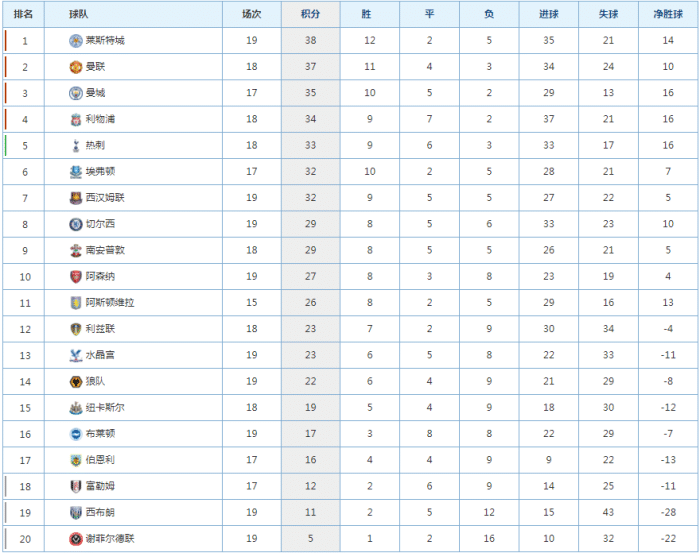 从目前英超的积分来看,榜首的莱斯特城拿到38分,少赛一场的曼联拿到了37分,少赛两场的曼城拿到了35分,随后利物浦有34分,热刺拿到33分,埃弗顿和西汉姆有32分,切尔西、南安普顿都是29分。这些球队和榜首的差距都不大,可以说都有争冠的可能性,当然严格来说排名第11的维拉也有机会争冠,他们目前拿到26分,比榜首的莱斯特城少了12分,但是他们少赛了四场比赛哦。而保级方面,垫底的谢菲联只有5分,倒数第二的西布朗有11分,倒数第三的富勒姆有12分。而降级区外的伯恩利有16分,布莱顿17分,纽卡19分,可以说保级争夺战也非常激烈。