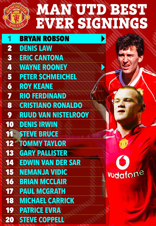 英国《442》杂志最近评选了曼联队史20大最佳引援,布莱恩·罗布森、丹尼斯·劳、坎通纳、鲁尼、舒梅切尔、罗伊·基恩、里奥·费迪南德、C罗、范尼和埃尔文跻身前十。球迷可以争论名次的话题,但有一件事毫无争议,后弗格森时代的引援无一入选。
