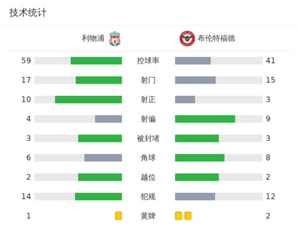 全场比赛结束,最终利物浦3-0布伦特福德。