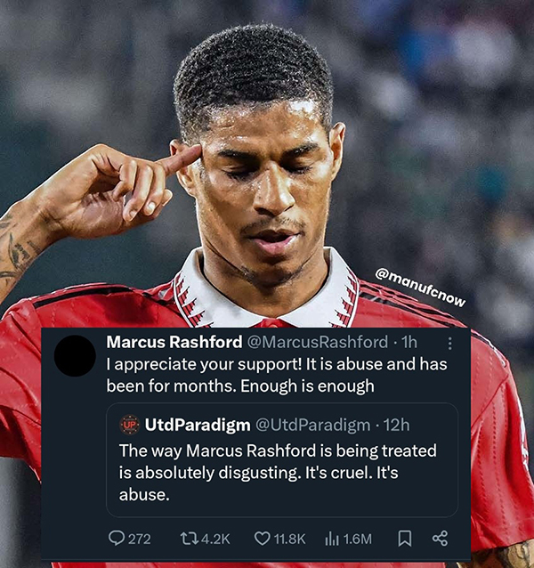 拉什福德在社媒上回应了一篇支持自己的评论,对方力挺曼联妖星,说他遭到的对待令人恶心,太残酷了,是一种虐待。对此,拉什福德回应道:「感谢你们的支持,这确实是虐待,而且已经持续了几个月。请适可而止!」