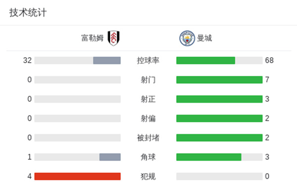 关键事件: 第12分钟,曼城首开记录!格瓦迪奥尔左路和德布劳内撞墙配合后内切晃过防守球员后推射破门,富勒姆0-1曼城。