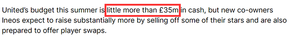 《每日邮报》称,吉姆·拉特克里夫爵士预计只给曼联3500万英镑的现金,其余转会资金只能通过出售现有球员来募集。桑乔、梅森·格林伍德、卡塞米罗、麦克托米内和马奎尔等人,都是较有可能卖出理想价格的球员。