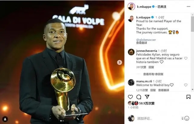 姆巴佩发文庆祝:“很荣幸被评为年度最佳球员,感谢大家的支持,旅程仍在继续。”