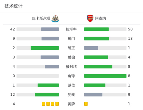 最终阿森纳客场0-1不敌纽卡斯尔。