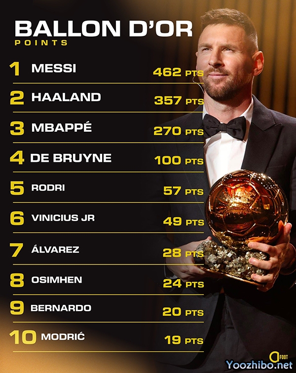 24直播网讯 11月4日讯 2023年金球奖30名得分公布,梅西462分夺魁,领先第二哈兰德多达105分。