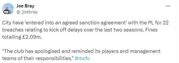 英超官方:“曼城已经和英超联盟达成一致,将为最近2个赛季与延迟开球相关的22次违规行为,而支付209万英镑罚款。”