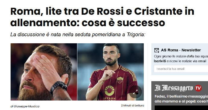 24直播网讯 北京时间8月29日,来自外媒Rai Sport的报道,新赛季内忧外患的意甲豪门罗马俱乐部,爆发了严重的将帅冲突。主帅德罗西与意大利国脚克里斯坦特在训练中直接动起了手。