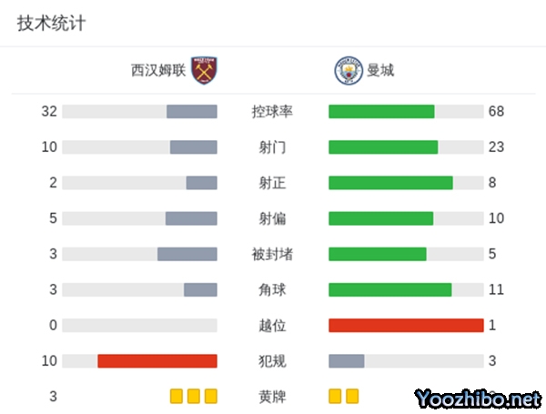 最终曼城3-1西汉姆三连胜领跑积分榜。