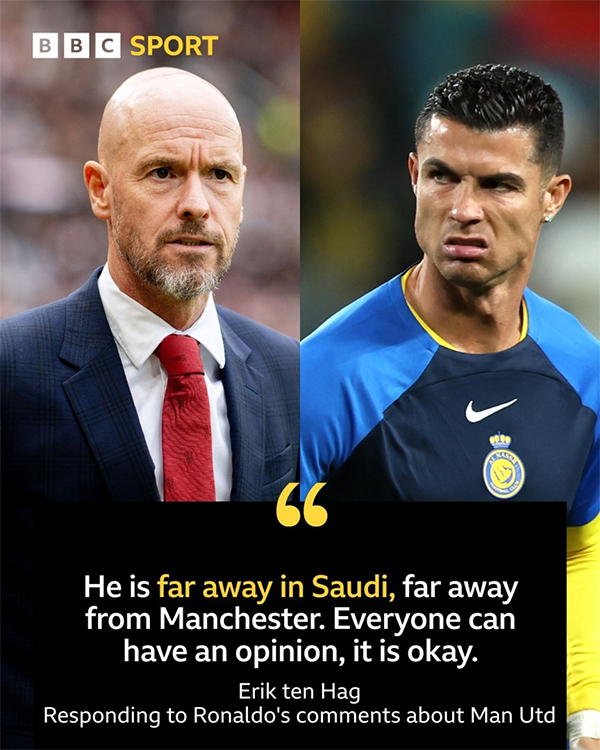 24直播网讯 北京时间9月13日凌晨,曼联主帅滕哈格出席了英超第4轮与南安普顿的赛前发布会。而发布会上,滕哈格也回应了此前C罗访谈中,提出的“曼联无法夺冠”的观点。滕哈格霸气回怼C罗:他远在沙特,这番言论影响不到我。