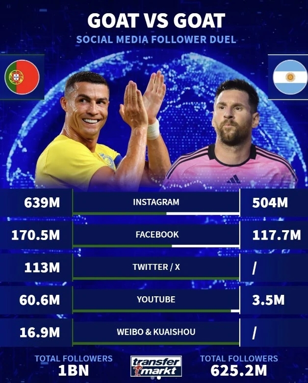 24直播网讯 【德转盘点梅罗社媒总粉丝量】C罗破10亿,梅西3平台共6.25亿