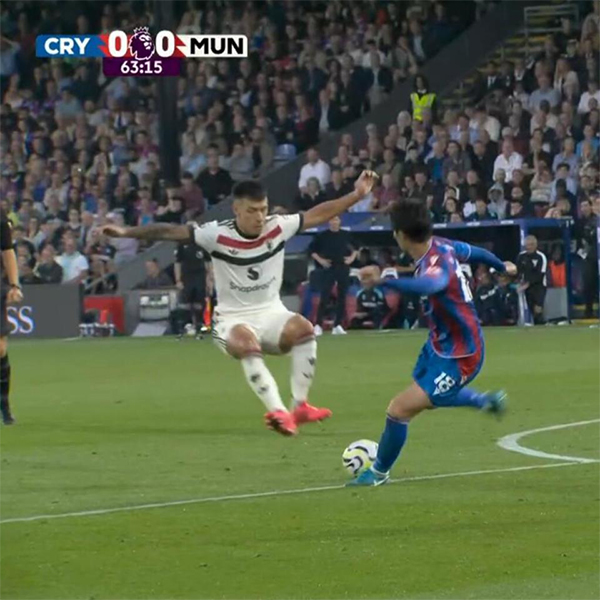 当时比赛进行到第64分钟,曼联的进攻被水晶宫防守球员解围,而皮球来到水晶宫中场镰田大地的脚下。而为了能抢回球权,心态着急的利桑德罗-马丁内斯竟然双脚腾空跳起来,像“踩气球”一样跺向镰田大地,试图吓退对手抢走皮球。