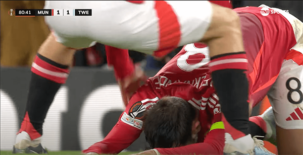 比赛最后阶段,马兹拉维前场断球,乌加特将皮球传给B费,后者一脚劲射,但皮球高出了横梁。看到射门没进,曼联队长跪倒在地,仰天长叹,然后趴在草地上。竞争对手梅森·芒特将他拉了起来,并告诉他振作,比赛尚未结束,还可以继续努力。