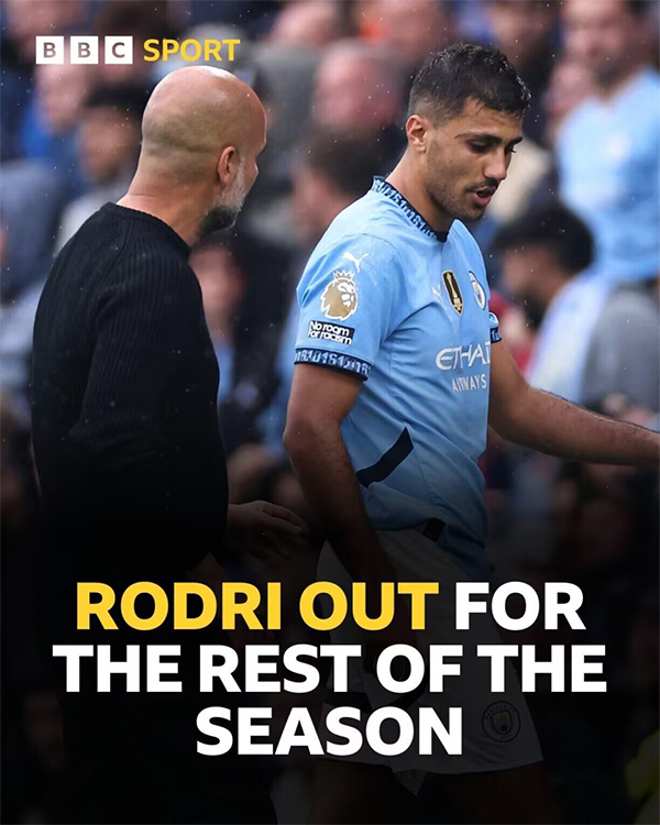 在上轮英超曼城主场2-2战平阿森纳的比赛中,赛季首次先发的罗德里,在开场被哈弗茨犯规后受伤,又在第17分钟与托马斯的对抗中伤势加重,随后并被科瓦西奇换下。令人唏嘘的是,罗德里刚复出仅10天便再次遭遇重伤。本赛季,罗德里只为曼城出场3次。