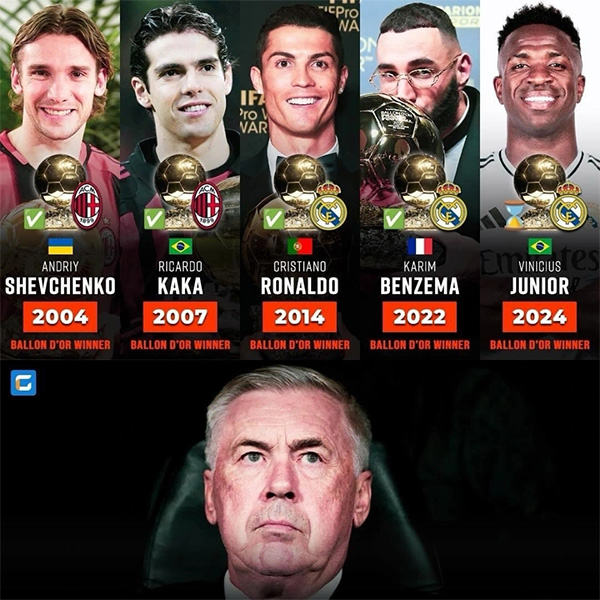 若维尼修斯获金球,将是第5位安切洛蒂执教下金球得主