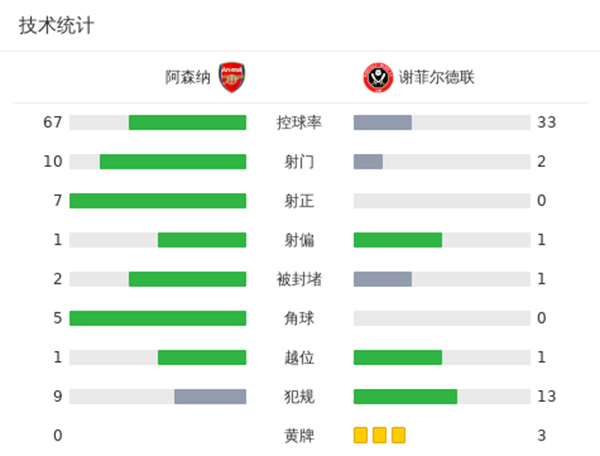 查看:阿森纳vs谢菲尔德联 全场录像技术统计: