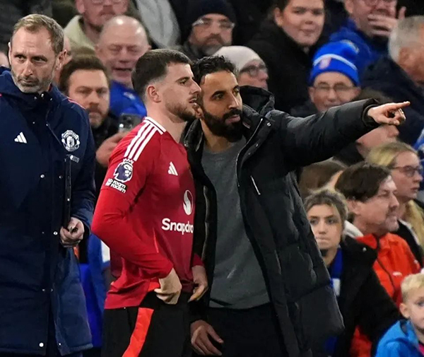 在曼联与伊普斯维奇的英超比赛中,坐在替补席的芒特与蹲在场边的阿莫林一样,将手指向迪奥古·达洛,提醒场上球员将球传给他,似乎展示了两人有相同的战术思考。