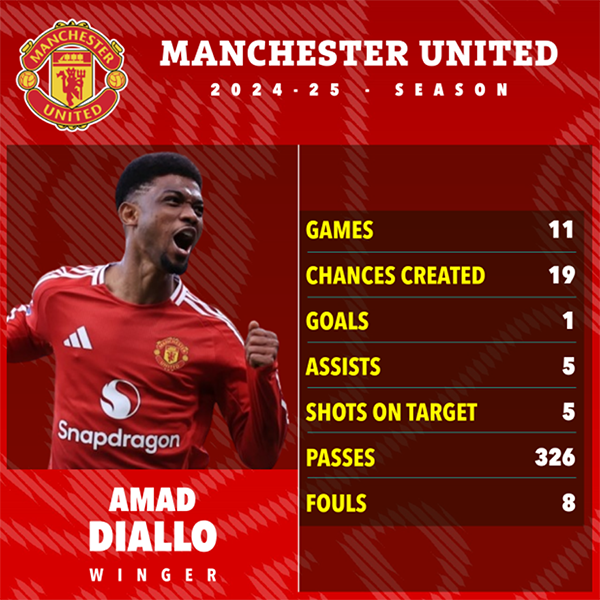 队友拉什福德也对迪亚洛赞不绝口:「活力和氛围不言而喻,球员在球场上创造了这种氛围,但今天的球迷是我们想听到的,只有积极向上和鼓励球员前进的声音。今天比赛并不像比分看上去那么简单,阿马德(迪亚洛)在反击中表现惊人,助攻了两球。他非常敏锐,无论有球还是无球,他总是攻击对手。我们必须了解其他队友的优势,这样才能互相促进。」