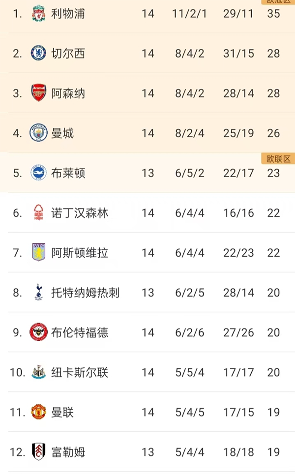 24直播网讯北京时间12月5日,英超结束了第14轮的多场比赛。本轮比赛,领头羊利物浦爆冷被纽卡逼平,领先优势缩至7分。而卫冕冠军曼城终结4连败触底反弹,切尔西、阿森纳则继续取胜,在积分榜紧追利物浦。