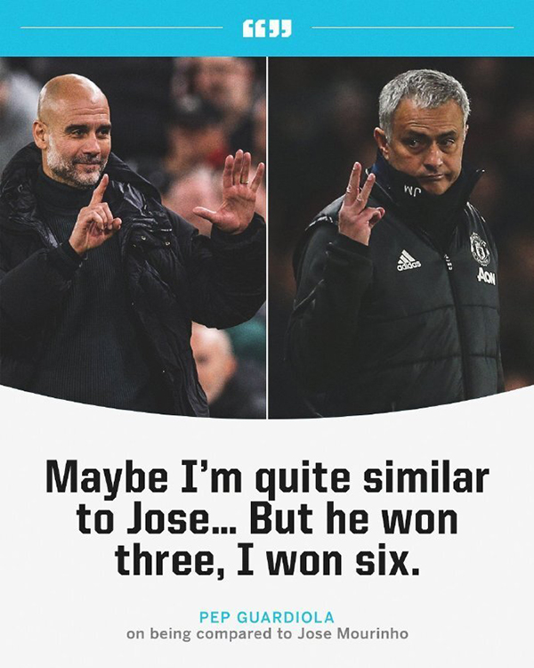 谈到自己的行为被拿来与穆帅对比,瓜迪奥拉此前曾表示:“我和穆里尼奥很像,但是他拿了3座英超,我拿了6座。”显然,瓜帅认为自己在英超,比穆里尼奥要成功。