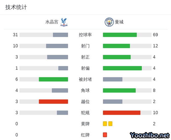 最终曼城2-2水晶宫,各项赛事客场已经连续六场不胜。