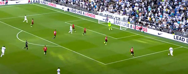 为了弥补中路的漏洞,曼联的四名后卫防守范围很窄,在边路不断给对手留下可乘之机。曼联做客热刺的比赛中,卢克·肖内收,亚历杭德罗·加纳乔没有及时紧逼库卢塞夫斯基,后者推进到禁区并且传中助攻萨尔得分,曼联队长、中场布鲁诺·费尔南德斯没有跟住对手。