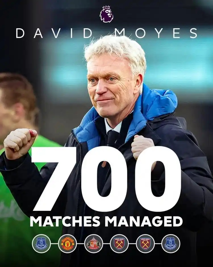 61岁的埃弗顿主帅大卫-莫耶斯,成为英超史上第3位执教场数达到700场里程碑的主帅。只有两名英超传奇主帅的执教场数比莫天才还多,温格828场,弗格森爵士810场。