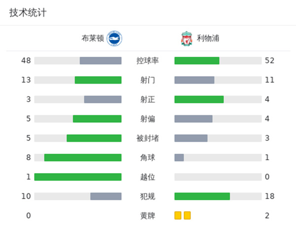 全场比赛结束,利物浦2-2战平布莱顿。