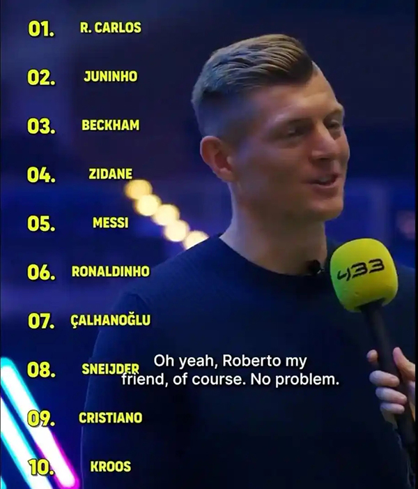 24直播网讯克罗斯在室内五人制足球联赛Icon League的现场接受采访,对任意球高手进行了“盲排”。