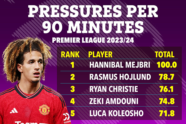 汉尼拔还打出了本赛季英超球员中场均逼抢力度最强的数据,他场均100次施压对手,比排名第二的曼联队友霍伊伦德多出了21.3次!这两个项目,都是赛季初曼联中场缺乏的因素,突尼斯国脚帮助滕哈格填补了空缺。