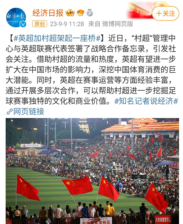 其次是足协方面的表态,根据经济日报的表态,对于英超和村超的合作,足协也是用了“架起一座桥”来表态,当下的足协认为这一次的合作,村超能够帮助英超提升在中国的影响力,而村超可以通过英超在赛事运营方面的丰富经验,开展多层次合作,帮助村超进一步挖掘足球赛事独特的文化和商业价值,从当下来看,足协更多是想要帮忙,而不是直接代替村超来成为这座桥,毕竟英超看重的可能也是村超本来的样子吧。