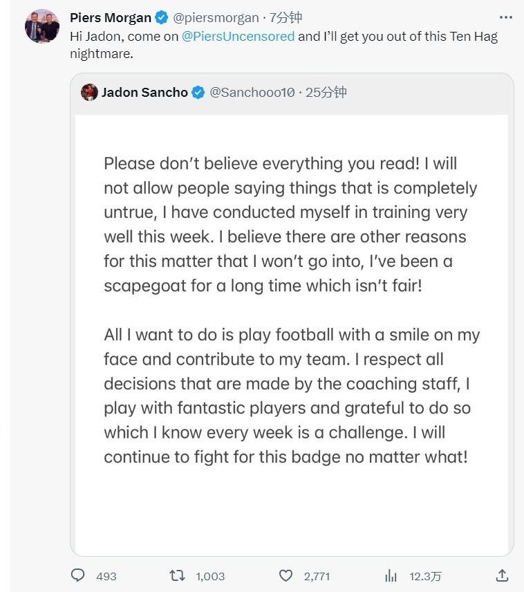 对于滕哈格的言论,桑乔彻底怒了,他一时间发声回击滕哈格:“请别相信任何你读到的。我不会允许人们去说完全虚假的事,我这周训练很好,我相信有其他的原因,但我们不会去谈论。很长时间以来,我都成了替罪羊,这不公平!”