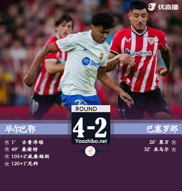 24直播网讯 1月25日讯 国王杯1/4决赛,巴萨对阵毕尔巴鄂。上半场开场仅38秒,巴萨后防解围失误,古鲁泽塔闪击破门,莱万同样也是利用毕巴解围失误扳平比分,亚马尔一条龙内切远射反超比分。易边再战桑塞特头槌破门扳平,亚马尔两次错失单刀。常规时间巴萨2-2毕巴进入加时赛。加时赛上半场补时,伊纳基关键破门,下半场补时,尼科锁定胜局。最终巴萨加时鏖战2-4不敌毕巴止步八强。
