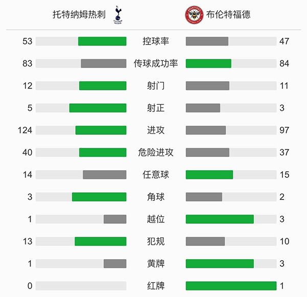 查看:热刺vs布伦特福德 全场录像技术统计: