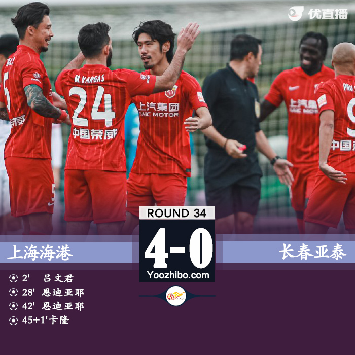 24直播网12月31日讯 北京时间12月31日15:00,中超联赛第34轮上海海港迎战长春亚泰的比赛,上半场吕文君闪击,恩迪亚耶双响,卡隆中超首球,下半场双方均无建树,最终海港4-0大胜亚泰。