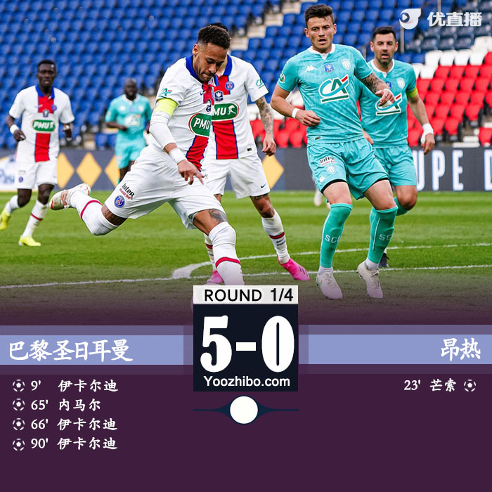 24直播网4月22日讯 北京时间4月22日0点45分,法国杯1/4决赛巴黎主场对阵昂热。上半场,伊卡尔迪单刀先拔头筹,内马尔制造芒索乌龙,拉吉半场结束前连续错失良机。下半场,内马尔和伊卡尔迪两分钟内各入一球,终场前伊卡尔迪完成帽子戏法,全场比赛结束,巴黎圣日耳曼5-0昂热。凭借本场大胜,巴黎轻松晋级法国杯半决赛。