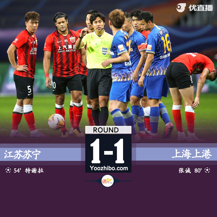 24直播网讯:北京时间10月29日晚19点35分,2020年中超联赛第二阶段第三轮(总第17轮)争冠组江苏苏宁和上海上港的比赛,在苏州奥林匹克中心开始。上半场江苏苏宁制造更多威胁场面,但没有进球。下半场第54分钟埃德尔右路送出精准直塞球,特谢拉反越位得手,禁区内挑射得分。第68分钟买提江铲球踢在张诚脚腕下,结果吃到红牌被罚下。第81分钟奥斯卡外围送球,王燊超拿球在禁区右侧传中,吕文君倒地卧射打疵,但球弹起砸在张诚脸上反弹进门。最终两队1比1踢平。