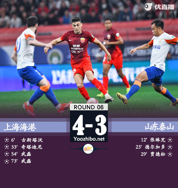 24直播网讯:北京时间4月14日,中超联赛第6轮,上海海港主场对阵山东泰山。上半场古斯塔沃开场闪击破门,卡扎伊什维利打门折射扳平,德尔加多小角度抽射扳平,贾德松头球扩大比分,莱奥-奇塔迪尼乱战扳回一球,下半场武磊扳平比分,崔康熙抗议裁判被罚下场,武磊头球梅开二度。最终比分上海海港 4-3 山东泰山。