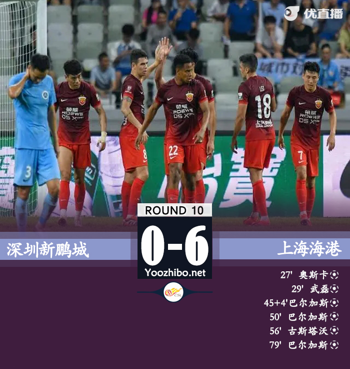 24直播网讯:北京时间5月5日晚上20:00,中超第10轮,上海海港客场挑战深圳新鹏城。上半场,王浩开场8分钟放倒武磊吃到直红,李智送点奥斯卡笑纳,茹萨先后助攻武磊和巴尔加斯破门。下半场,巴尔加斯梅开二度,奥斯卡助攻古斯塔沃破门,奥斯卡造点巴尔加斯戴帽。全场结束,上海海港6-0深圳新鹏城。本场过后,上海海港6胜3平积21分排名第二,近两轮进11球失0球状态大火;深圳新鹏城2胜3平5负积8分,排名第12位。