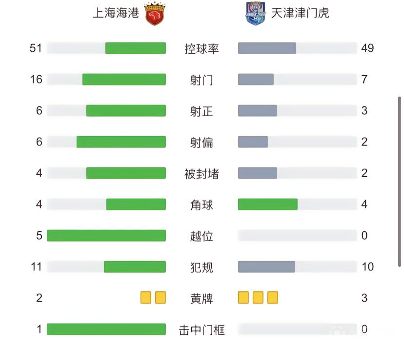 最终全场比赛结束,最终上海海港2-1天津津门虎。