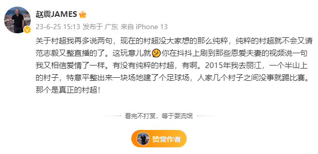 不过也有人站出来反驳范志毅,知名足球记者赵震老师在社交媒体上多次点评村超,他表示:“关于村超我再多说两句,现在的村超没大家想的那么纯粹,纯粹的村超就不会又请范志毅又整直播的了。这玩意儿就你在抖抖上刷到那些恩爱夫妻的视频说一句我又相信爱情了一样。有没有纯粹的村超,有啊。2015年我去丽江,一个半山上的村子,特意平整出来一块场地建了个足球场,人家几个村子之间没事就踢比赛。那个是真正的村超!”