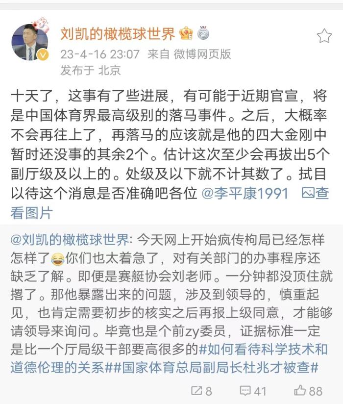 随后,在16日,刘凯引用了自己的动态表示:十天了,这事有了进展,有可能近期官宣,将是中国体育界最高级别的落马,之后,大概率不会再往上了,再落马的应该是他的四大金刚中暂时还没有事的其余两个,估计这次至少会再拔出5个副厅级以上的,处级及以下就不计其数了。