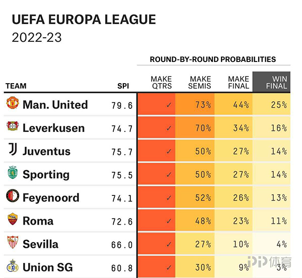 24直播网03月18日讯 欧联杯1/4决赛抽签结果出炉,FiveThirtyEight数据统计各队夺冠概率如下。