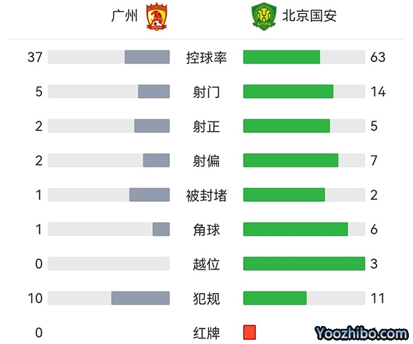 全场比赛结束,最终广州队1-3国安,遭遇19轮不胜。