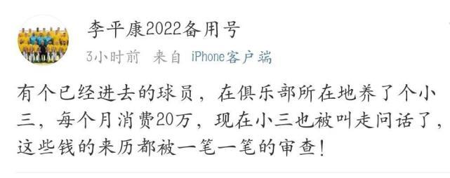 李铁厨师这边的闹剧还没有结束,李铁那边又立功了,根据知名足球媒体人李平康爆料,此前被李铁供出被抓的球员又有了新料出现。根据李平康的报道:有个已经进去的球员,在俱乐部所在地养了个小三,每个月消费20万,现在小三也被叫走问话了,这些钱的来历都被一笔一笔审查。