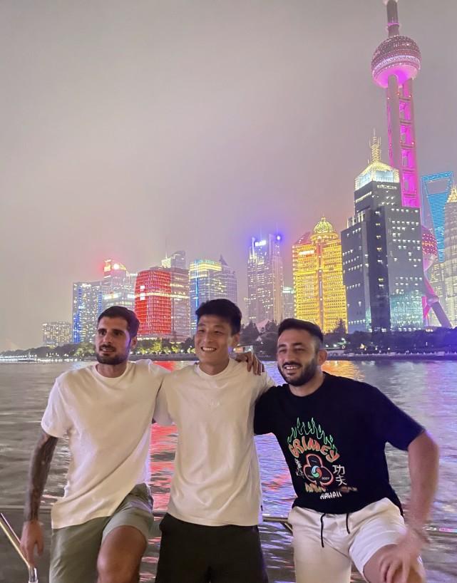 照片中,武磊陪着梅里达、巴尔加斯乘游艇夜游上海。武磊和梅里达穿着白色短袖,而巴尔加斯则穿着带有汉字“功夫”字眼的黑色短袖。三人在灯光炫目的外滩两岸徜徉。久别重逢后,三人勾肩搭背,脸上都露出开心的微笑,看起来武磊带着两位前队友玩得很尽兴。武磊还附图写道:“欢迎你们来中国,我的朋友们。”