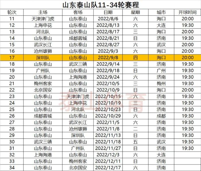 从赛程的安排看,泰山队未来7场有6个客场,只有1个主场,而且有4场比赛安排在海口进行。泰山队7月30日提前抵达海口进行备战,球队未来两个月的时间,在海口的比赛场次比济南更多,球队需要提前做好各方面准备。9月份,泰山队在主场要先后对阵武汉三镇和上海海港,这也是两场非常重要的比赛。收官阶段,泰山队的主场较多,而最后一场比赛是主场对阵国安。